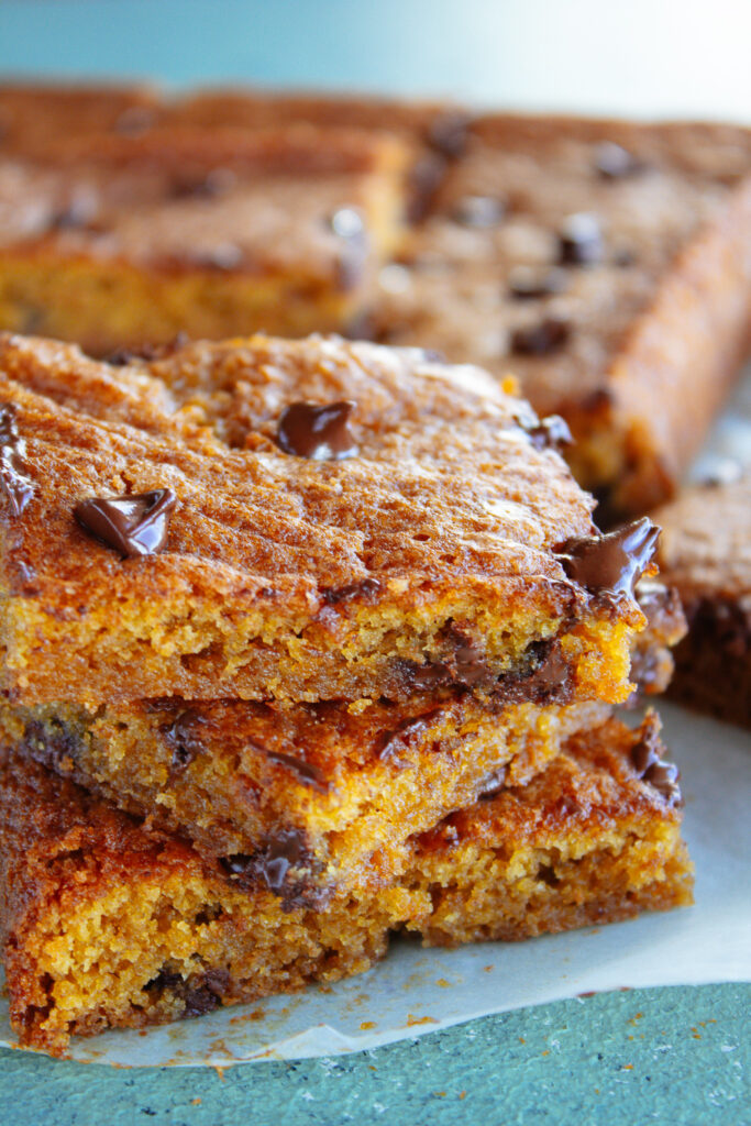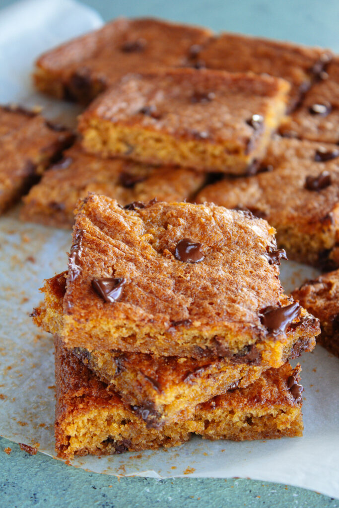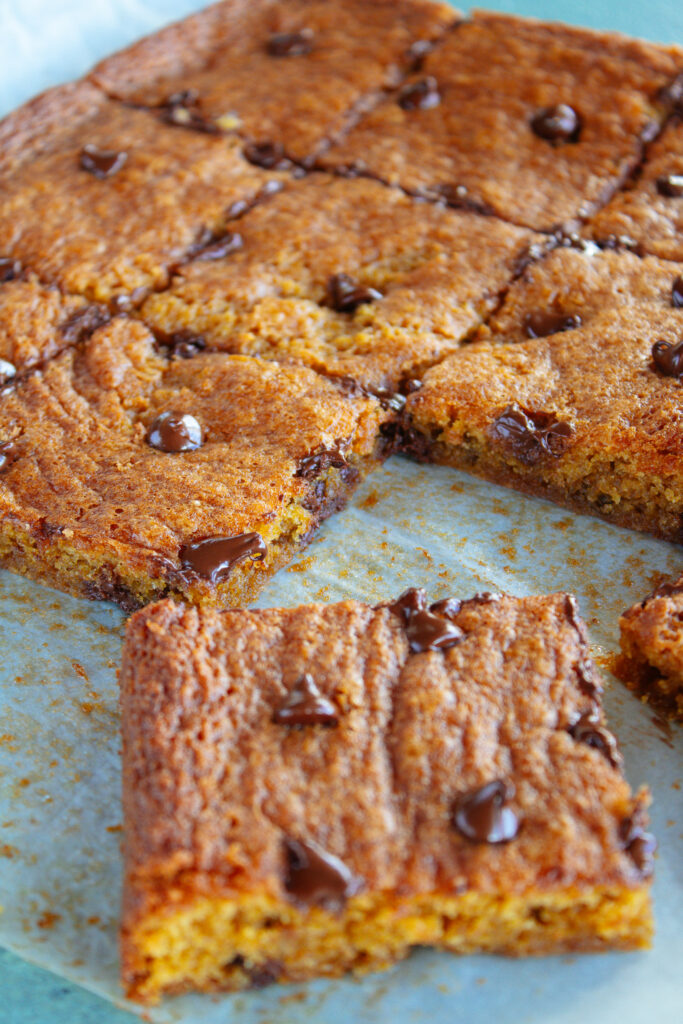 Remove from the oven and sprinkle the remaining chocolate chips over the blondies. Let the blondies cool down in the pan for 3-5 minutes before serving.