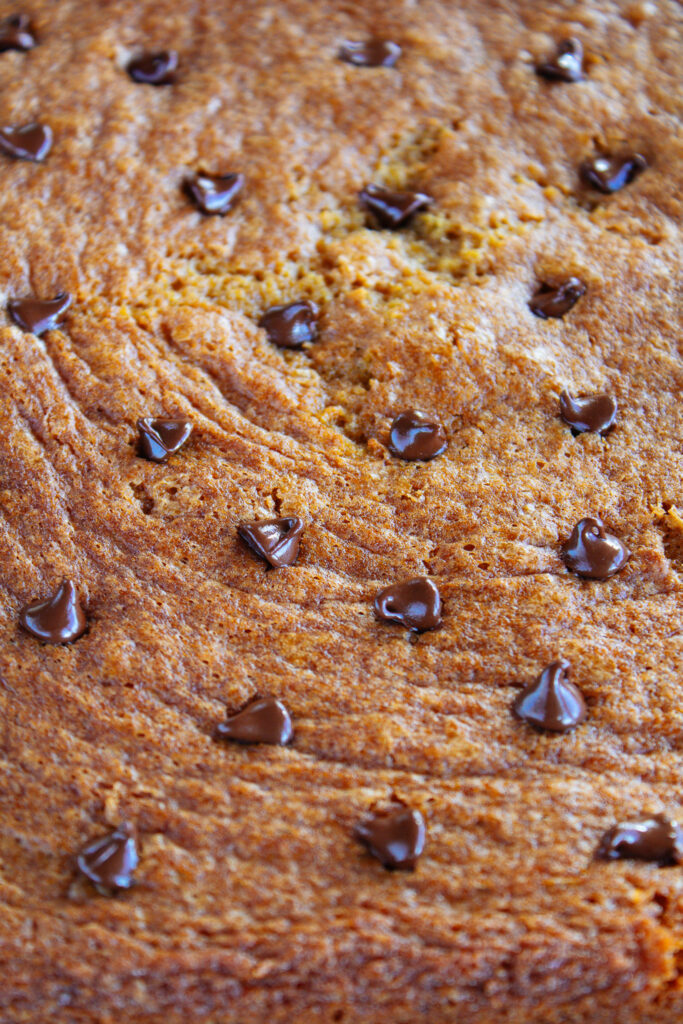 Transfer to the prepared baking pan and sprinkle the chocolate chips over the batter (leaving a handful left to decorate the top with when they come out of the oven) Bake in the oven for 18-20 minutes.