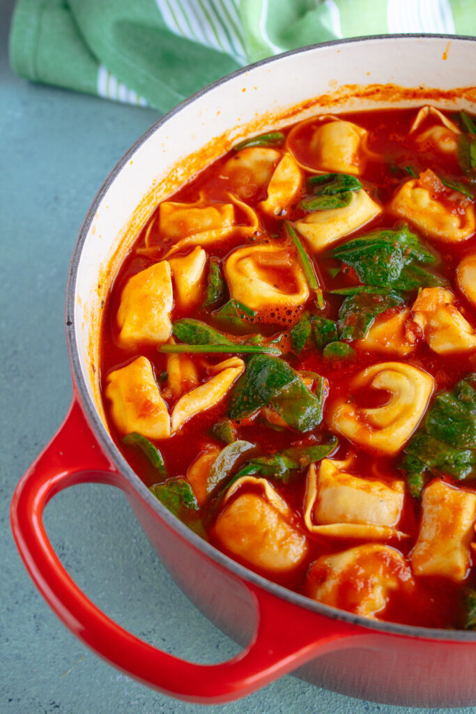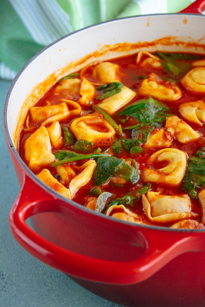This Italian inspired Chicken Tortellini Tomato Soup is super easy to make and so comforting. It’s perfect for using up leftover cooked chicken. It’s ready to serve in under 45 minutes and pairs perfectly with your favorite type of bread.