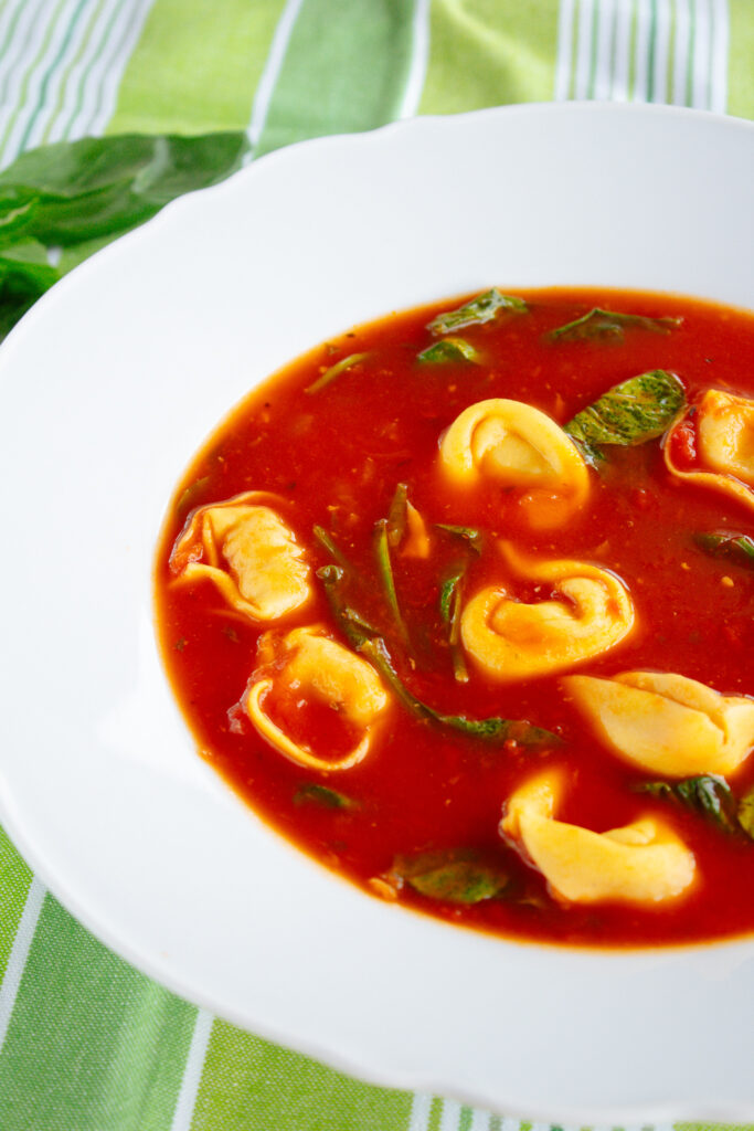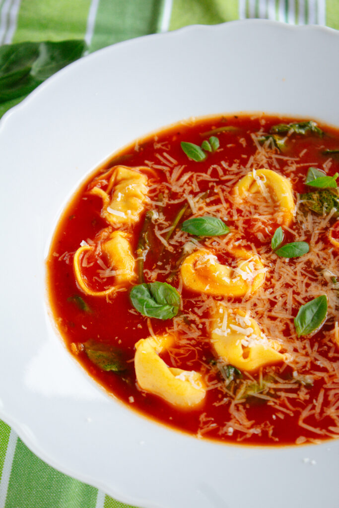 Chicken Tortellini Tomato Soup with delicious fresh Italian flavors. Perfect for using up leftover cooked chicken. It’s ready to serve in 45 minutes and pairs perfectly with your favorite type of bread.