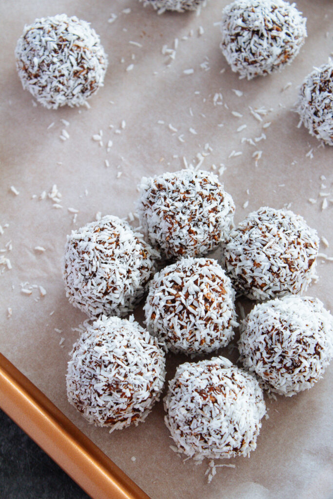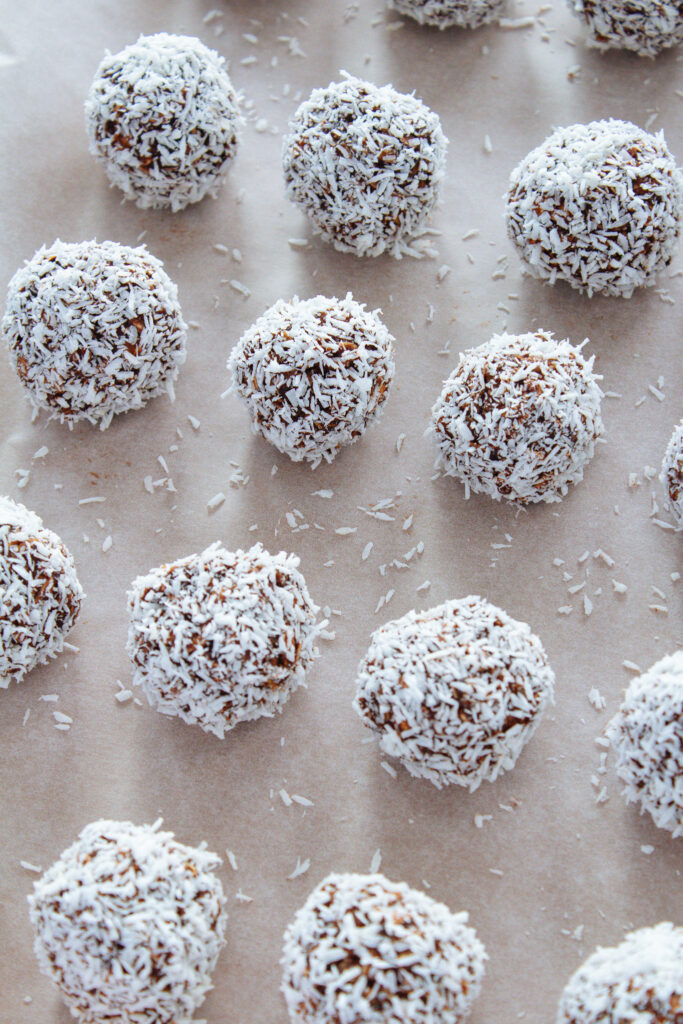 Using a tablespoon scoop the mixture into your hands and roll into small balls. Coat in the shredded coconut.