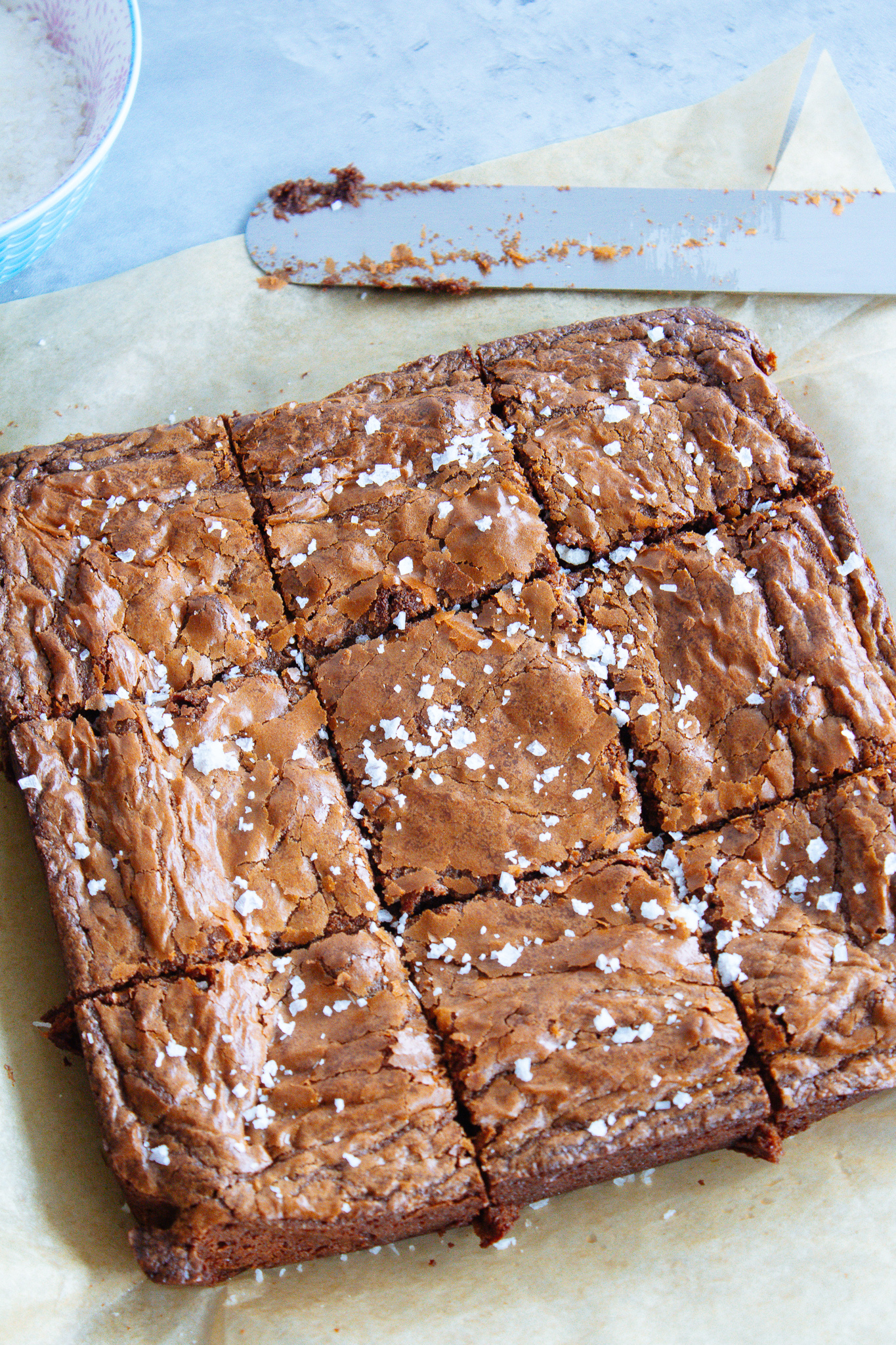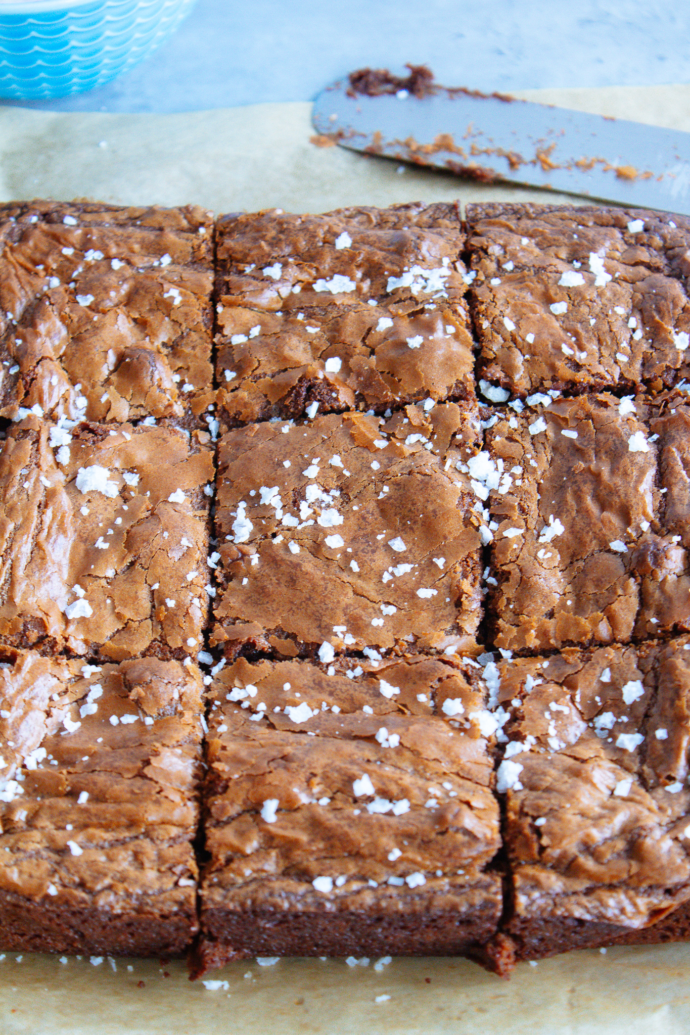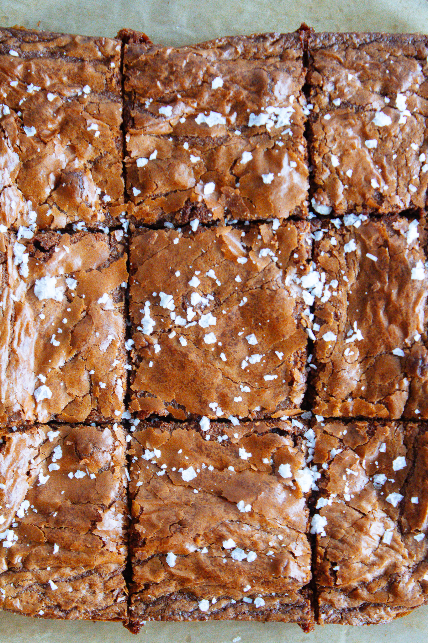 Let the brownies cool in the pan for 10-15 minutes before removing and cutting into squares. Garnish with flaky sea salt and serve.