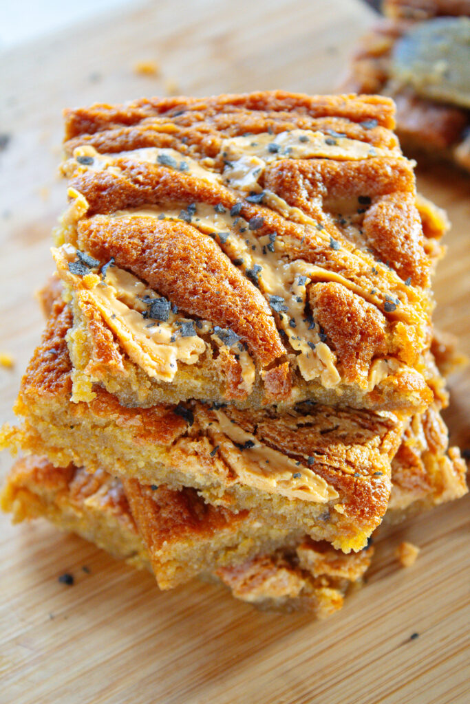These Lava Salt Peanut Butter Blondies are simply divine. Their salty and sweet flavor is addicting. Imagine the perfect chewy blondies with sea salt or in this case black lava sea salt. Pretty right? and then topped with swirls of natural and creamy peanut butter. Lava salt peanut butter blondies are perfect for dessert or weekend baking.