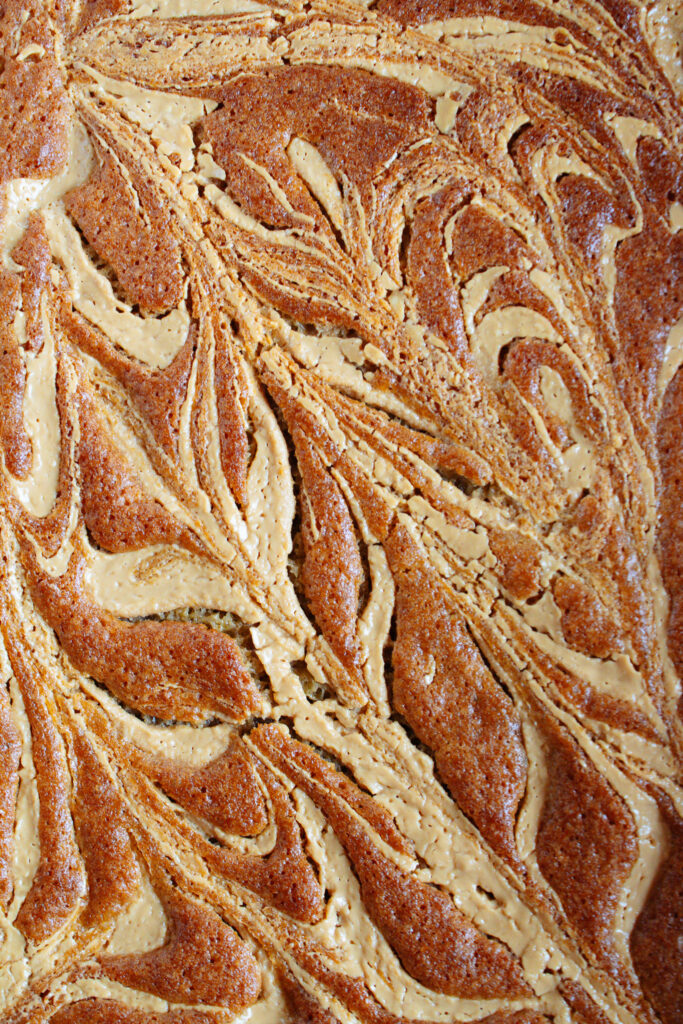 Transfer to the prepared baking pan and gently swirl the remaining peanut butter into the batter.